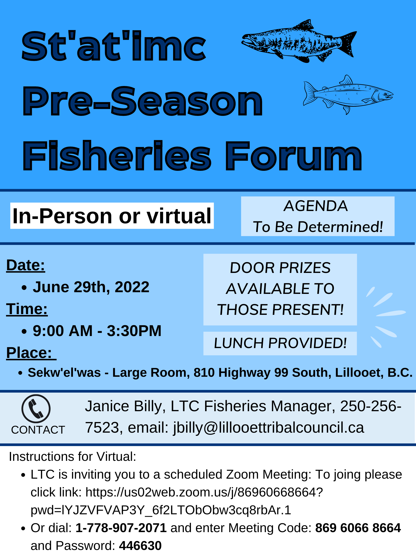 ST’AT’IMC PRE-SEASON FISHERIES FORUM In-person or Virtual Date: June 29, 2022 Time: 9am – 3:30pm m Place: Sekw'el'was– large room, 810 Highway 99 South, Lillooet, BC AGENDA TBD Door Prizes and Lunch Available! ____________________________ Instructions for virtual: Lillooet Tribal Council is inviting you to a scheduled …