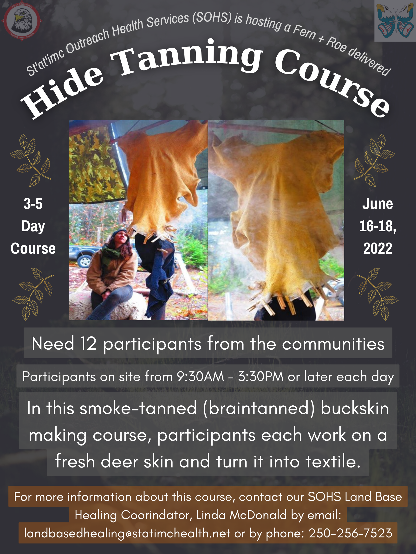 St'át'imc Outreach Health Services (SOHS) Land Based Healing program is hosting a Fern + Rae delivered Hide Tanning Course! This is a 3 day course that goes for the duration of June 16-18, 2022. Participants are to be on site from 9:30 AM - 3:30 PM …