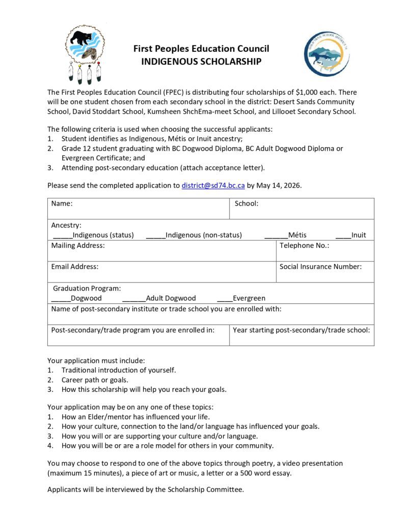 he First Peoples Education Council (FPEC) is distributing four scholarships of $1,000 each. There will be one student chosen from each secondary school in the district: Desert Sands Community School, David Stoddart School, Kumsheen ShchEma-meet School, and Lillooet Secondary School.